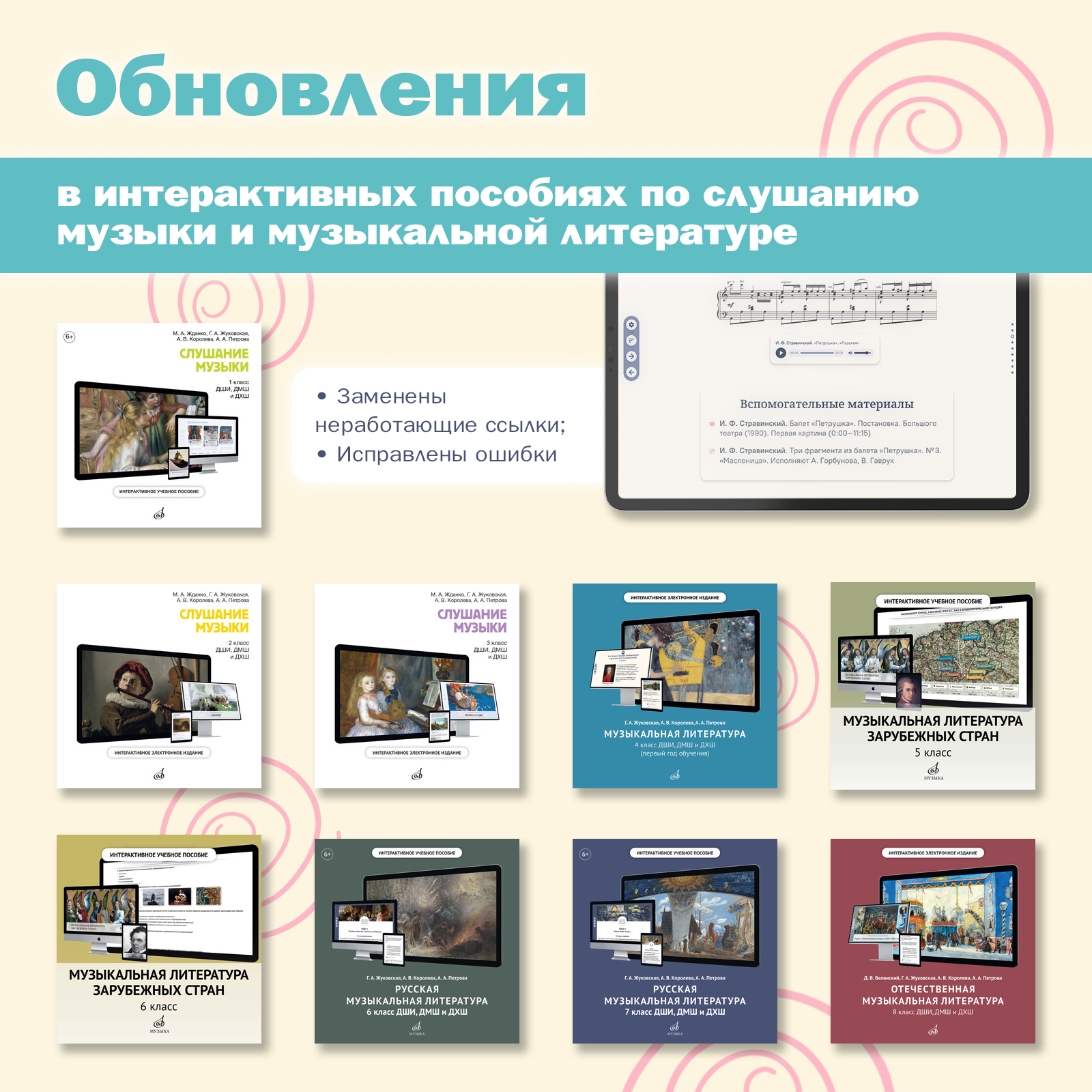 Мы рады сообщить, что наши интерактивные электронные издания по предметам «Слушание музыки» и «Музыкальная литература» обновлены! Внешние ссылки, ведущие на заблокированные ресурсы, были заменены, чтобы вы могли с удобством пользоваться материалами.