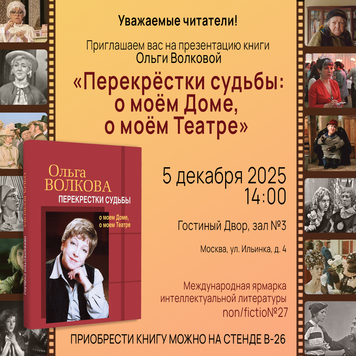 Приглашаем вас на презентацию книги Ольги Волковой «Перекрёстки судьбы: о моём Доме, о моём Театре», которая состоится 5 декабря 2025 года в зале №3 в рамках Международной ярмарки интеллектуальной литературы non/fictio№27.